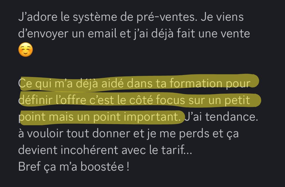 Alors tu peux vendre facilement n’importe laquelle de tes offres (High Ticket ou non)…SANS appel de vente, SANS webinaire, et SANS recourir à des techniques douteuses de “forcing” :-)
