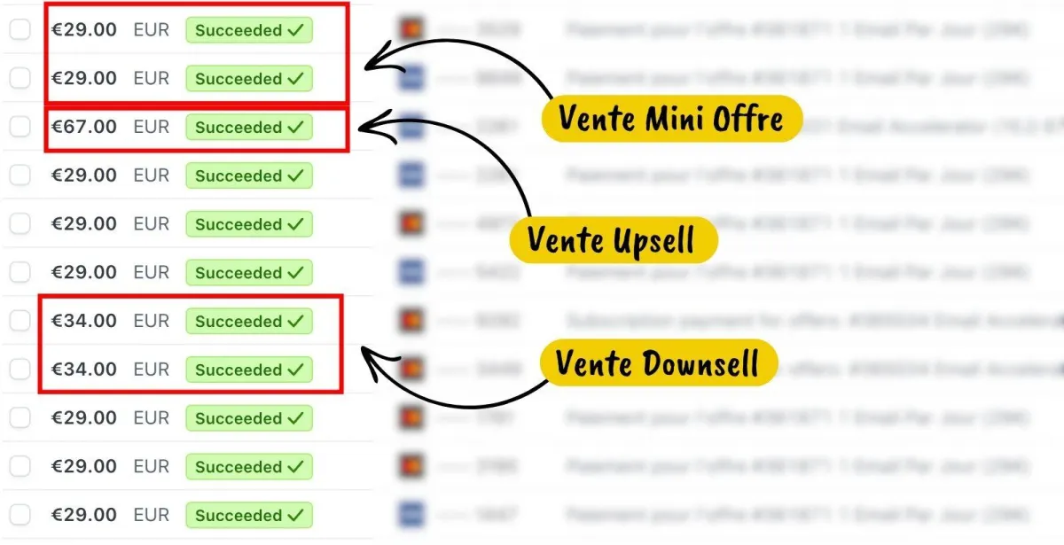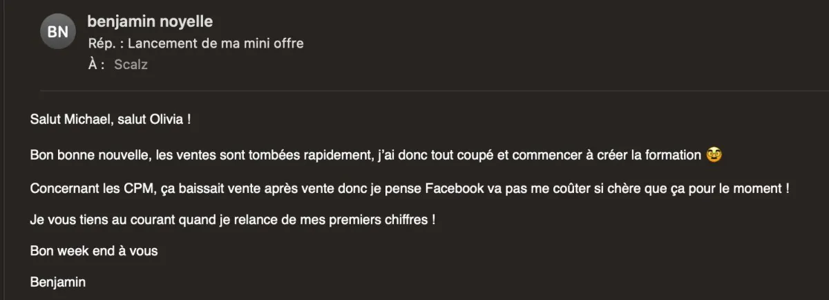 Et à la suite de notre Mini Offre en email copywriting à 29€, on vend un programme sur les tunnels de vente à 1297€, et ça marche très bien...